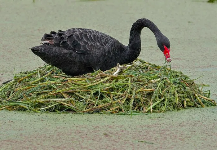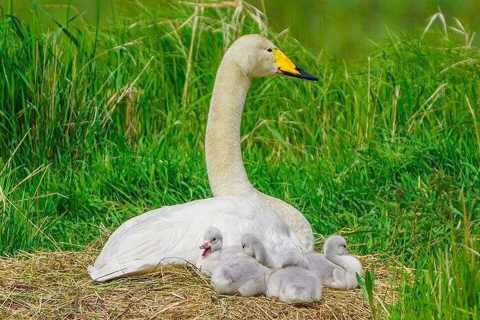 У лебединій сім’ї існує чіткий поділ обов’язків. Самка висиджує яйця і піклується про пташенят, а самець завзято охороняє гніздо. Обидва батьки практично невідлучно знаходяться поряд з виводком, поки малюки не «стануть на крило». Така пильність життєво необхідна, адже гнізда лебеді будують у досить вразливих місцях – біля кромки води, де їм загрожують хижаки.